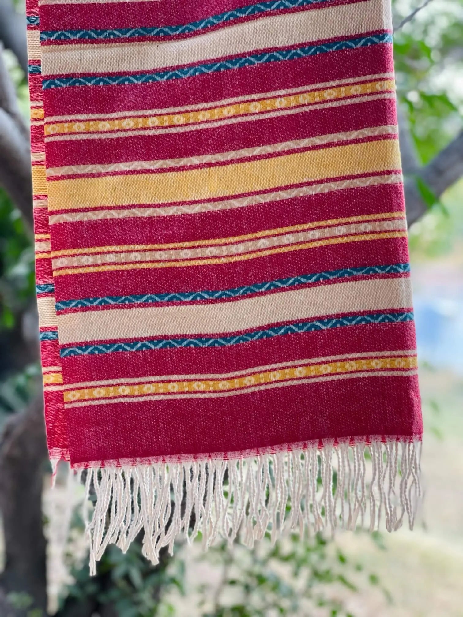 This gorgeous piece is like wearing a cozy hug that's ridiculously stylish. The bold red and mustard stripes add a pop of personality to any outfit, and the creme color background keeps things classy and elegant.