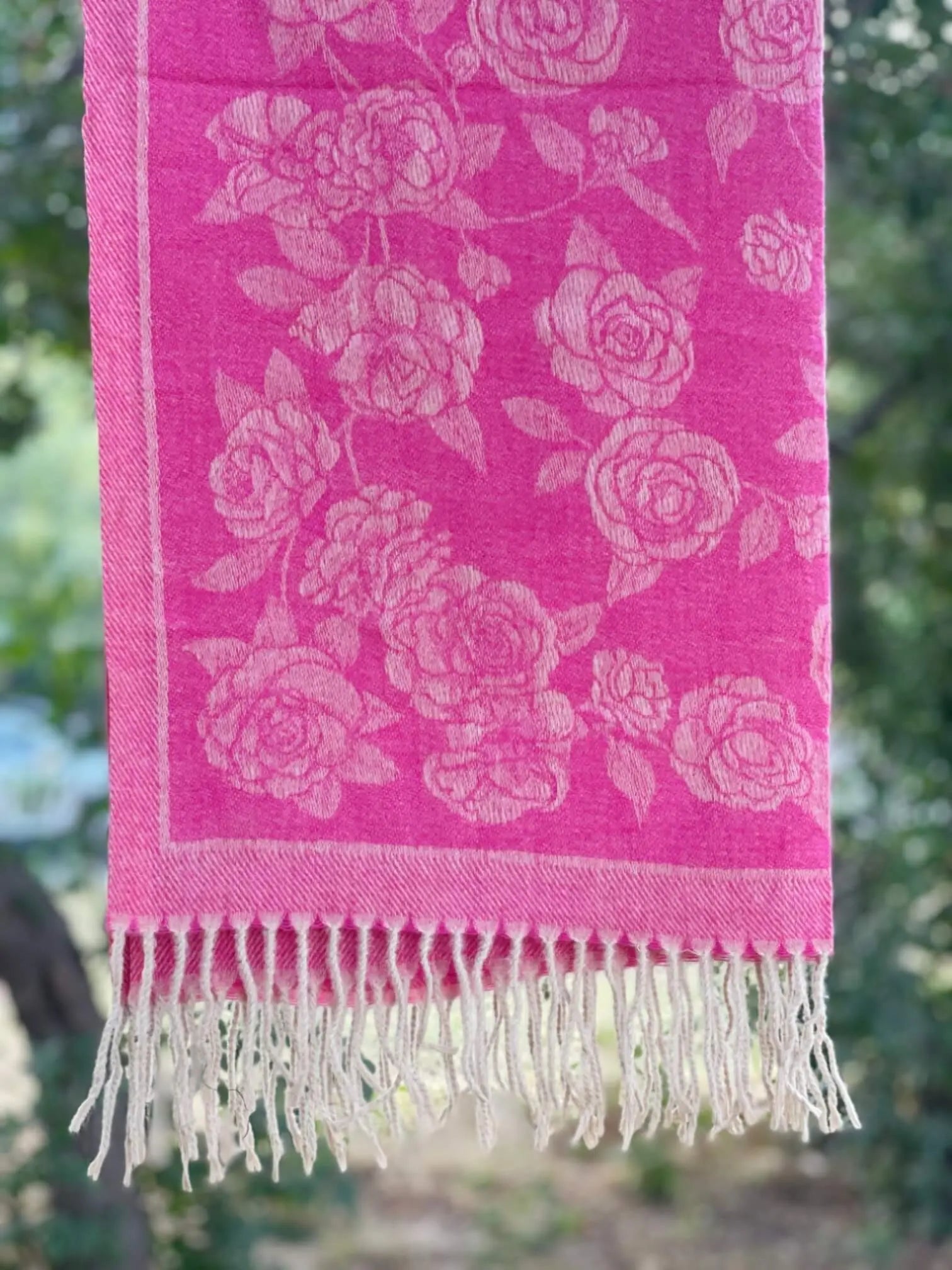 Bright and bold, the shocking pink and skin floral wool cashmere hijab is designed for those who love making a statement. The subtle skin shade balances the vibrant pink hue, creating a striking contrast that grabs attention.