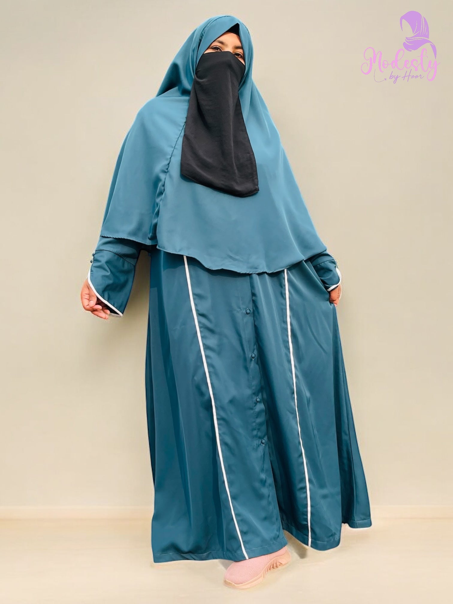 This teal Nida fabric abaya is the most gorgeous thing! The color is an amazing blend of blue and green, which is currently on trend. It's like wearing a piece of the ocean.