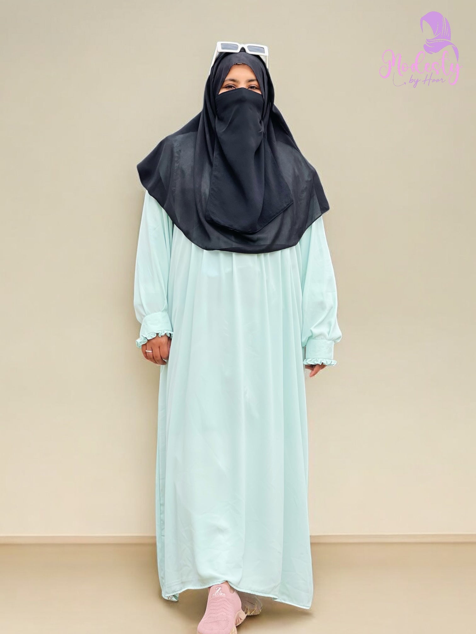 The design features a beautiful combination of ruffles and pleats, creating a harmonious balance of structure and flow. The pleated sleeves add an extra layer of elegance, enhancing the overall look to one of timeless charm. The delicate stitching ensures a perfect fit that accentuates the abaya's graceful silhouette.