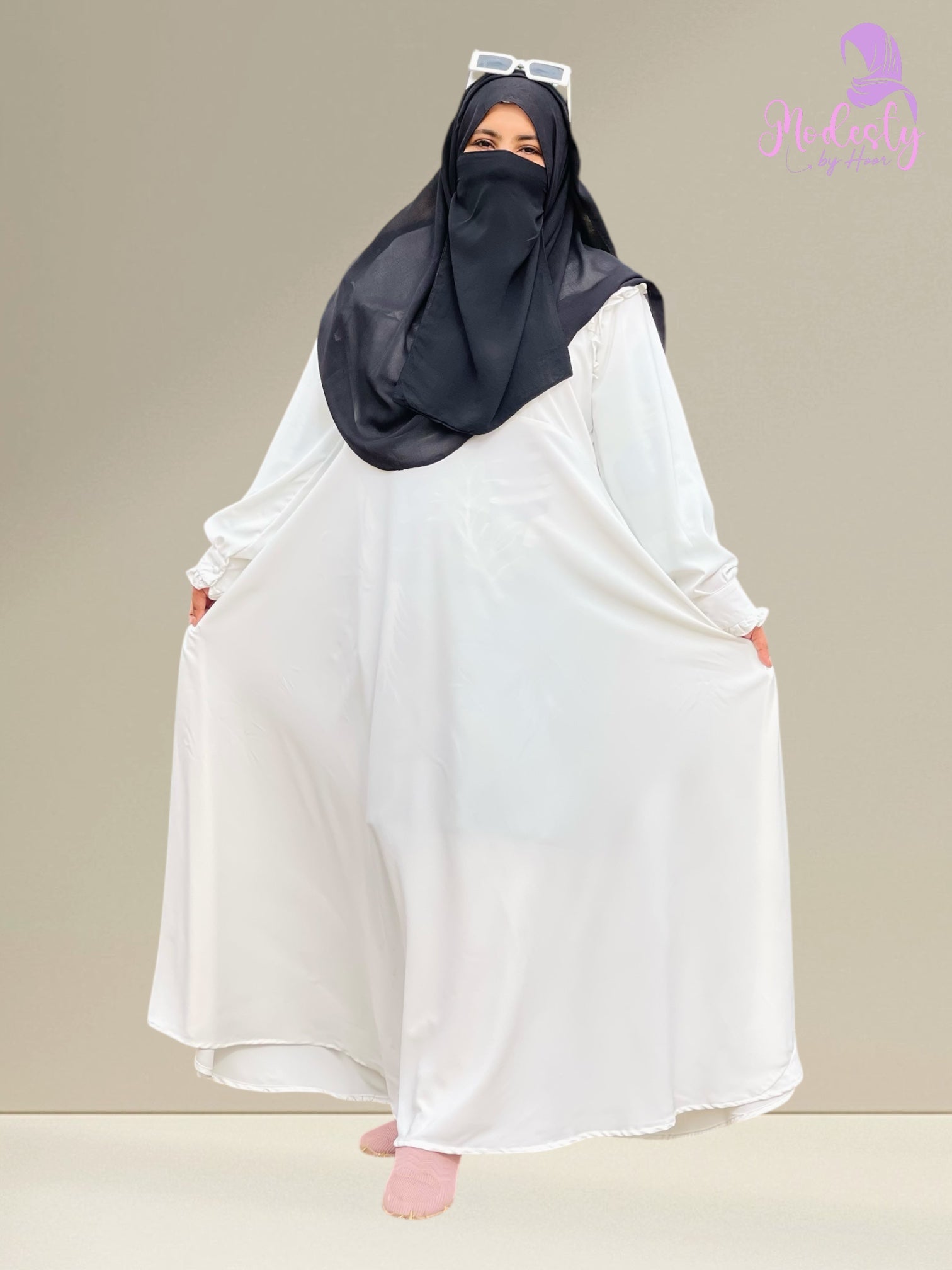 Crafted from premium Nida fabric, this white umbrella bottom abaya offers a perfect balance of elegance, comfort, and practicality. The flowy silhouette, combined with pleated cuff sleeves and a dome frill style, creates a timeless and graceful look suitable for any occasion.