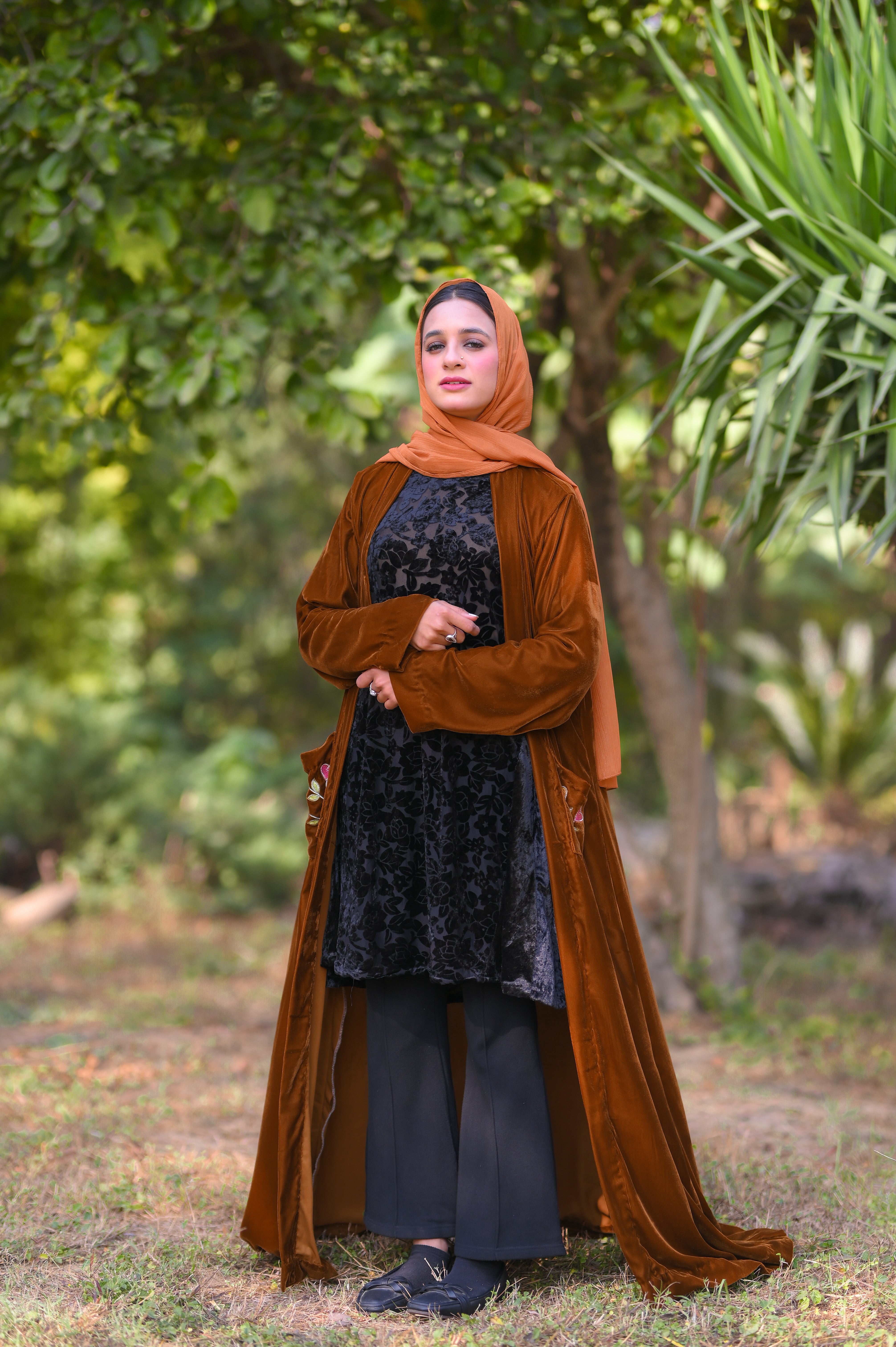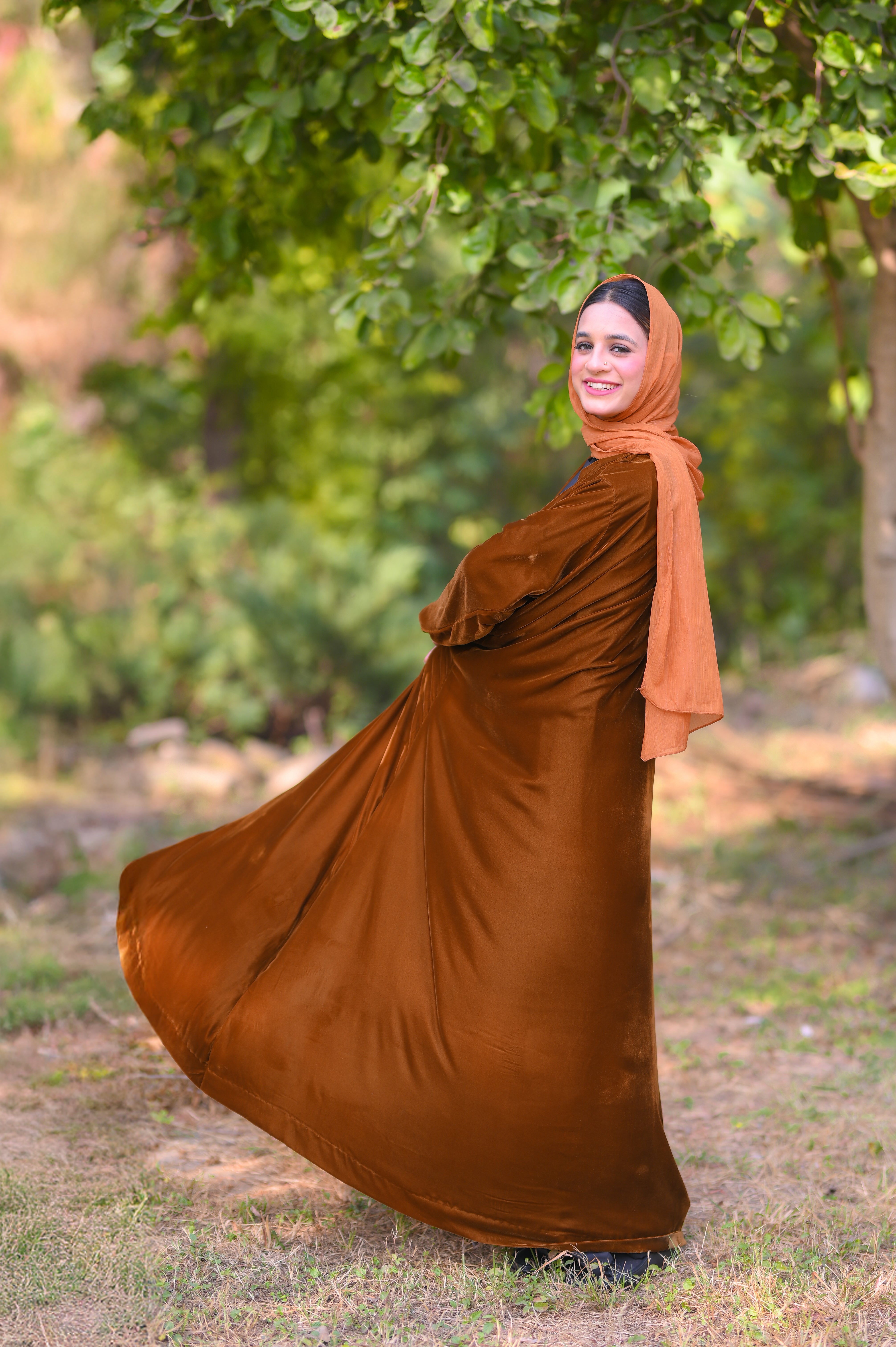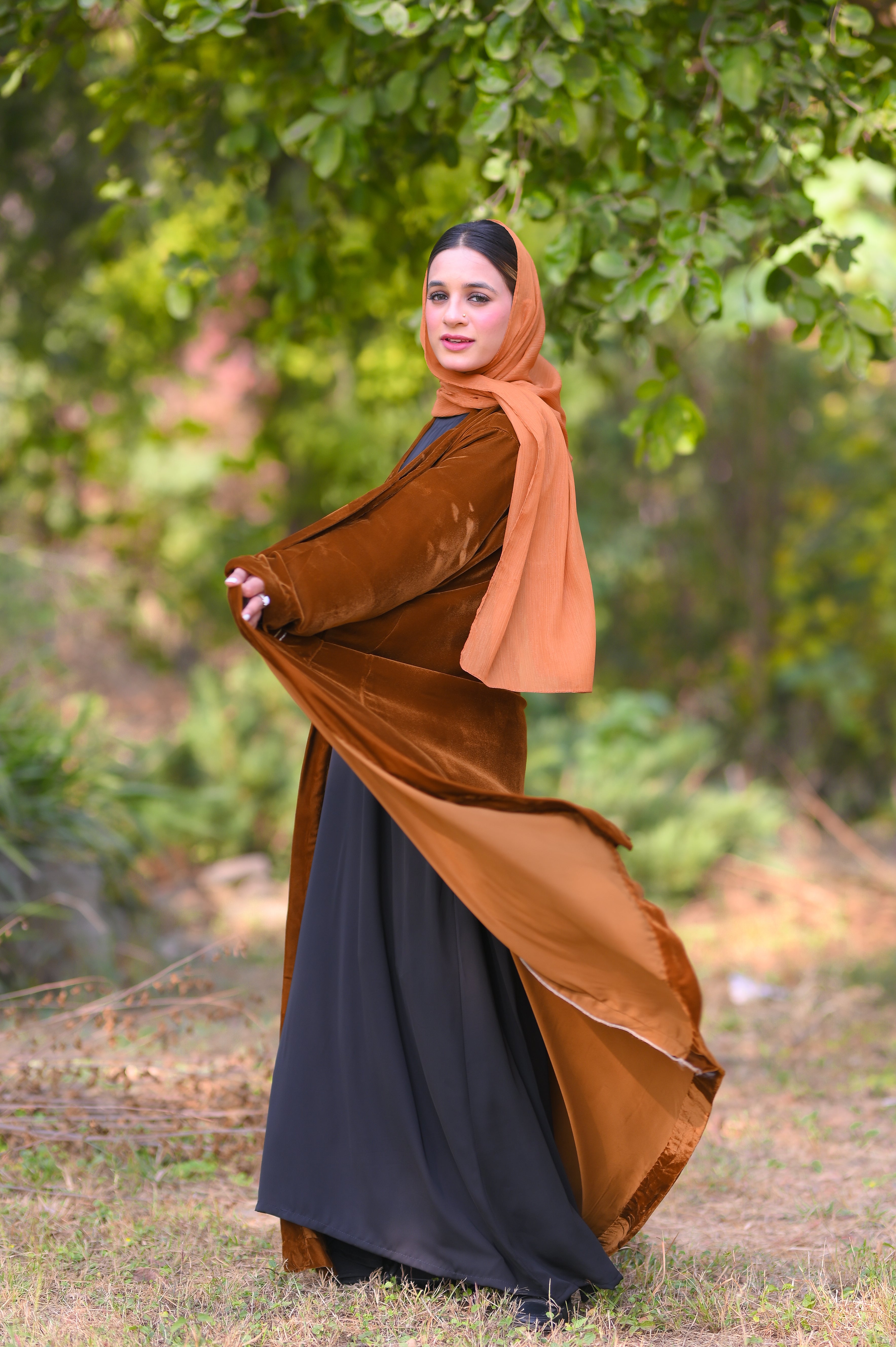 This abaya is crafted from premium gold velvet soft, rich, and naturally warm. The fabric has a glowing sheen that catches the light in the most graceful way.