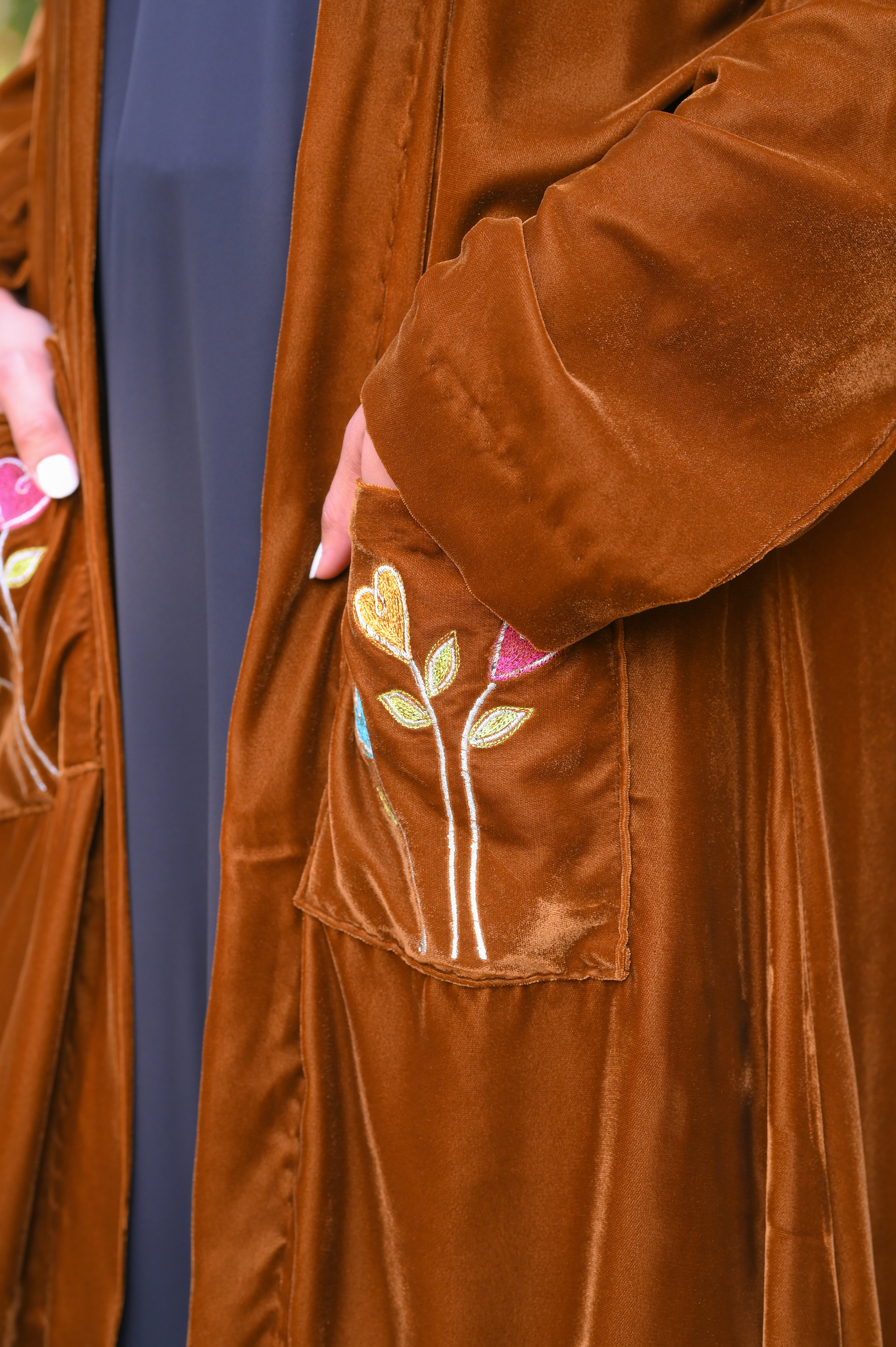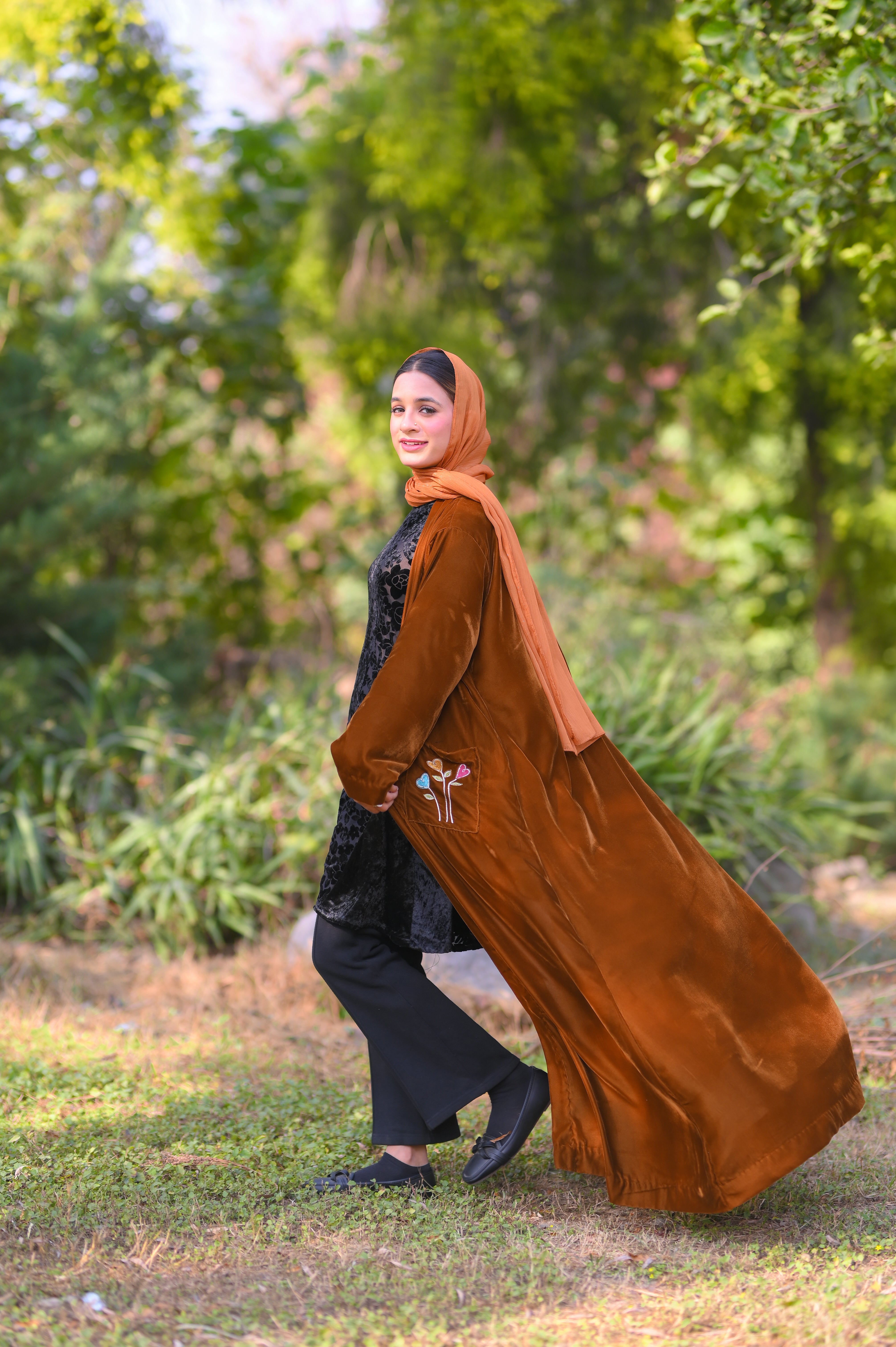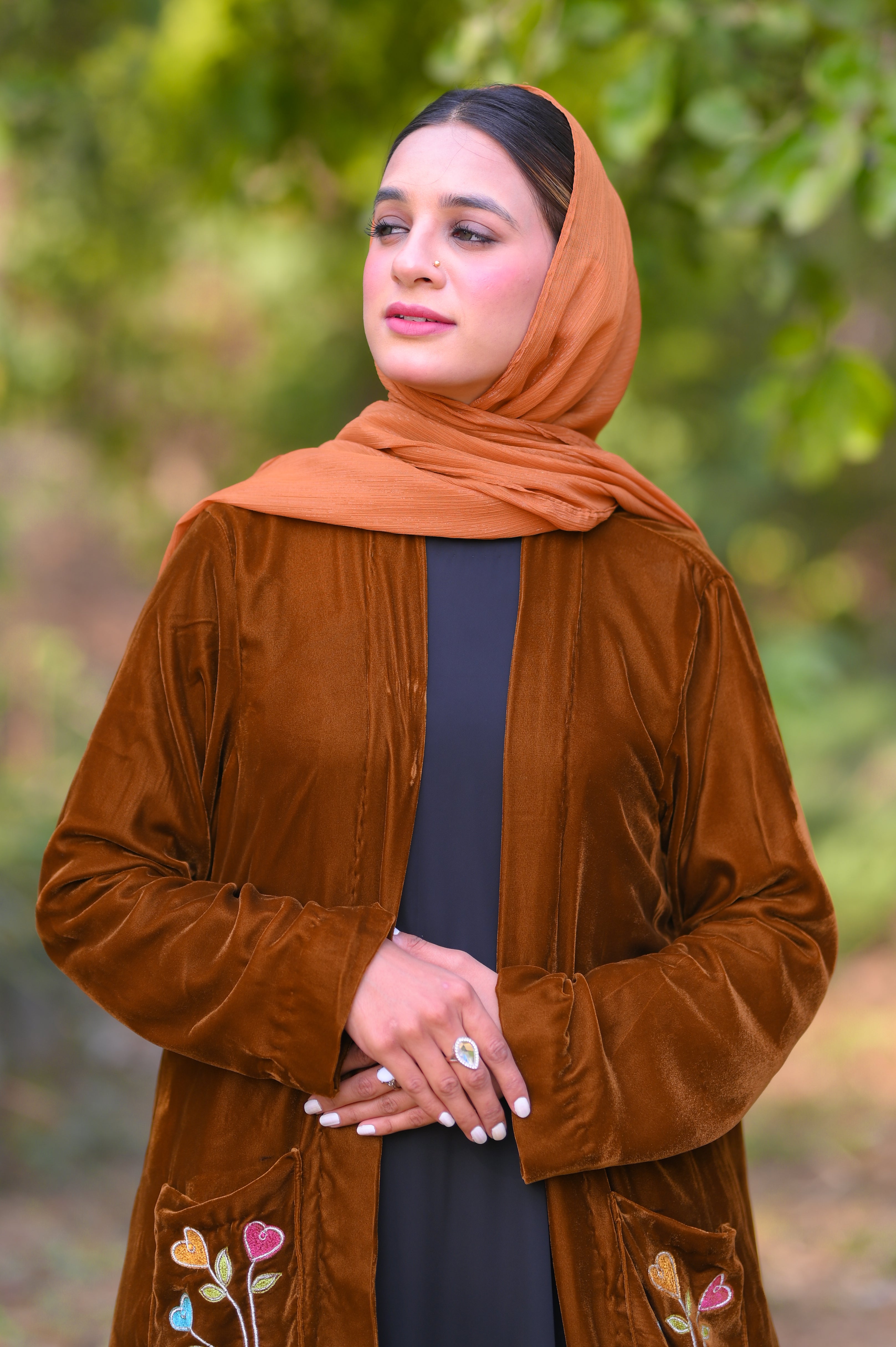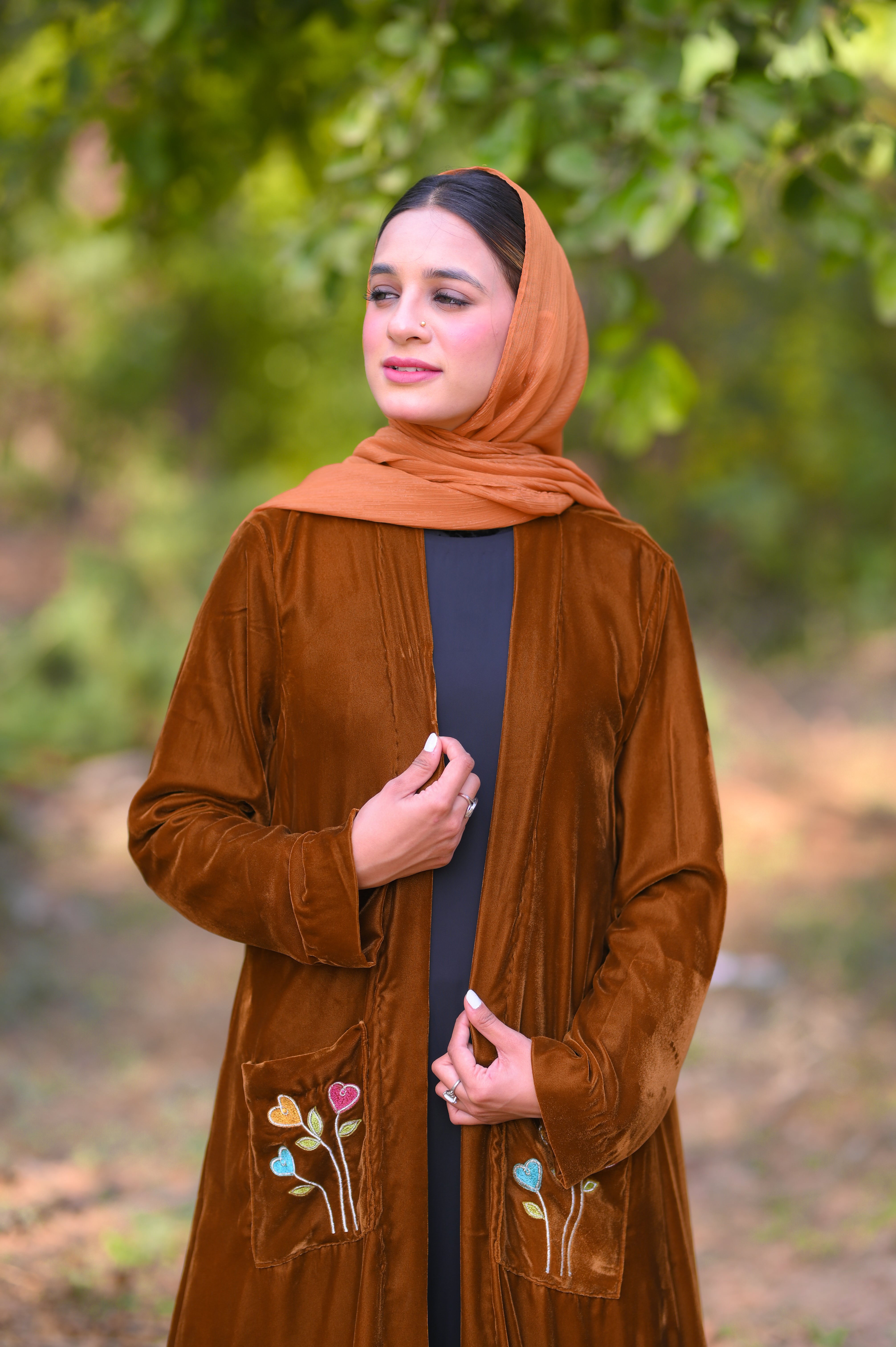 This abaya is crafted from premium gold velvet soft, rich, and naturally warm. The fabric has a glowing sheen that catches the light in the most graceful way.