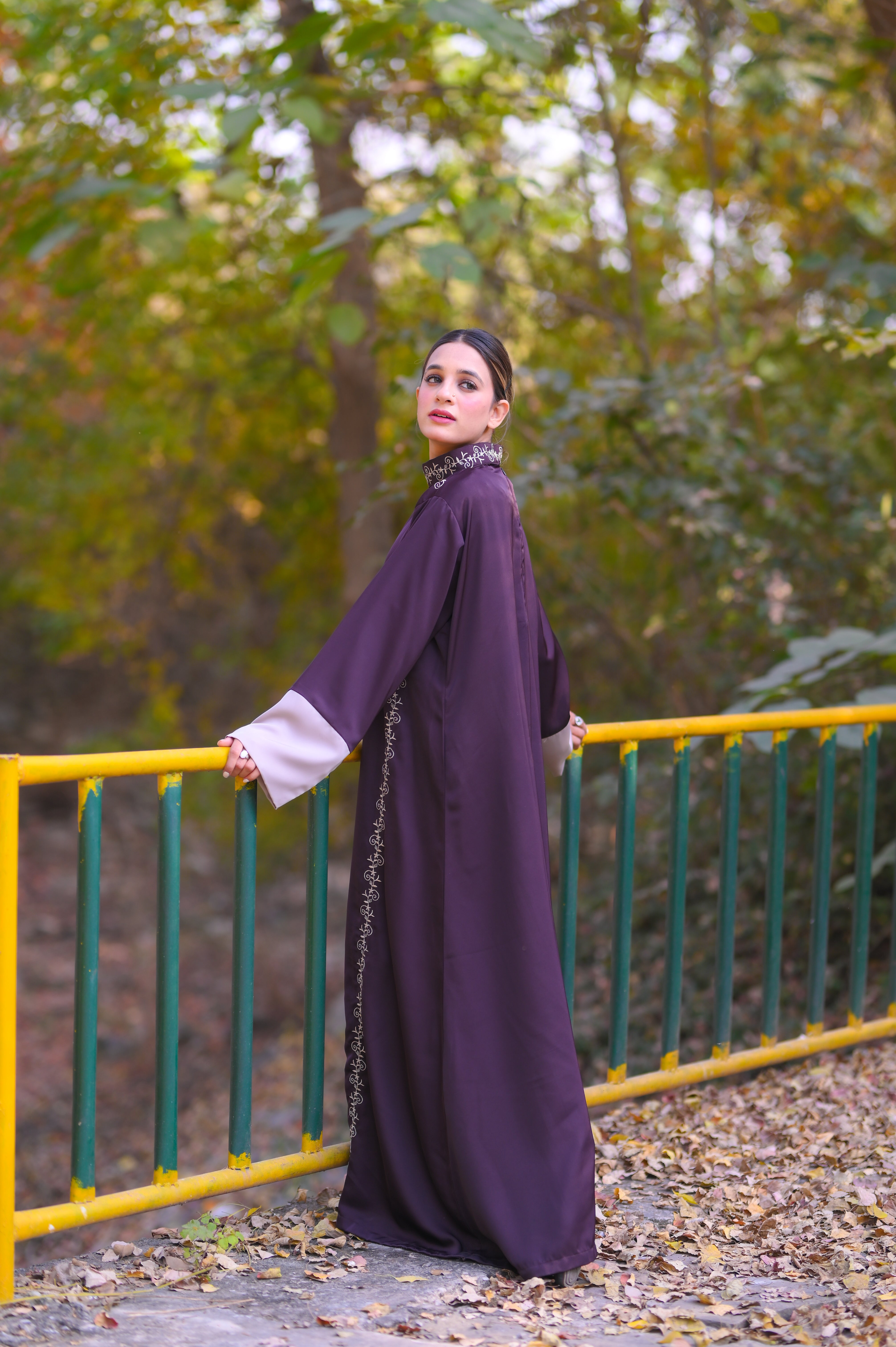 This abaya brings a calm, royal feel with its deep chocolate-brown color and soft cream embroidery running neatly along the front. It has a very graceful fall, making it look gentle and refined from every angle.