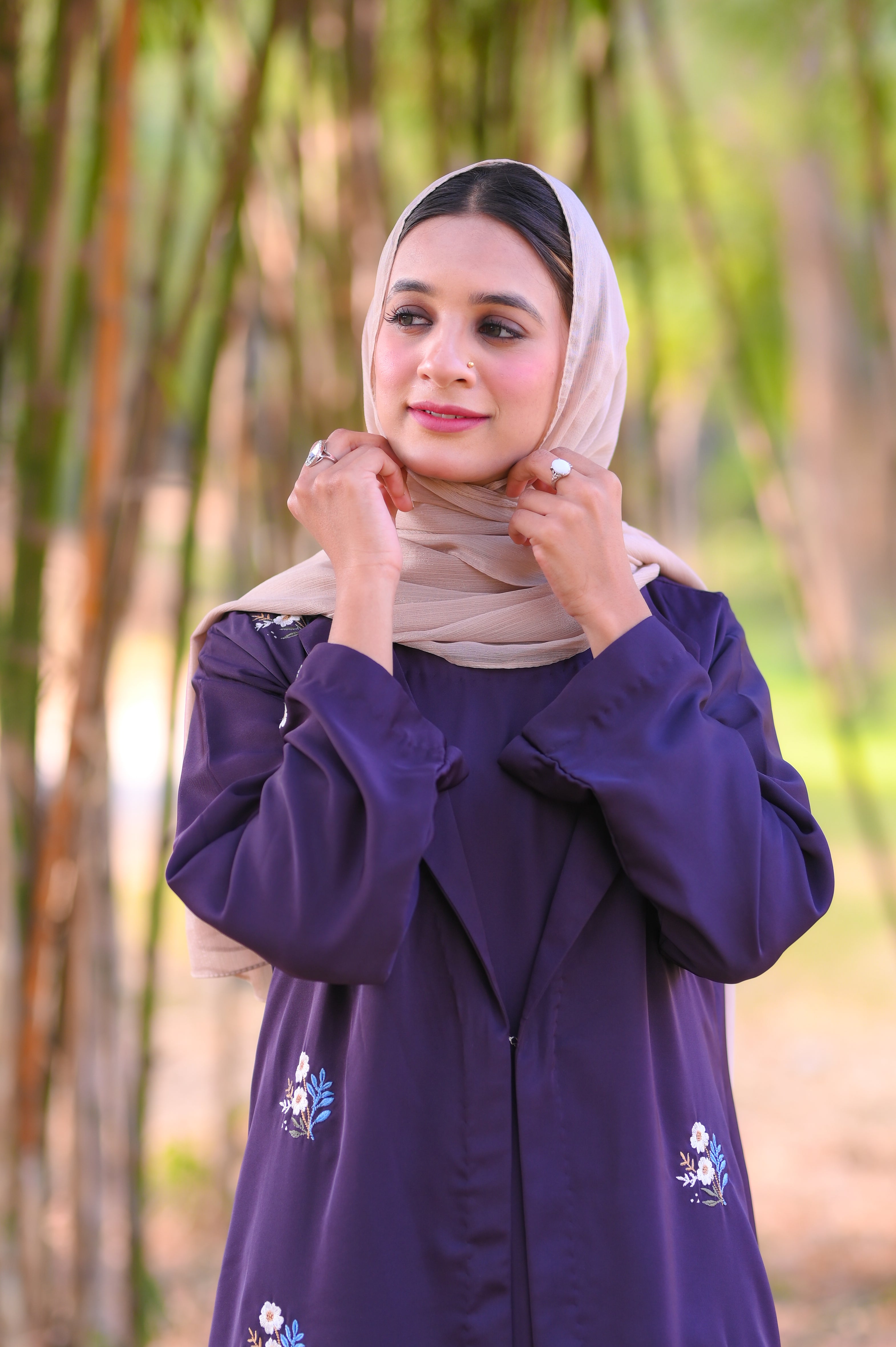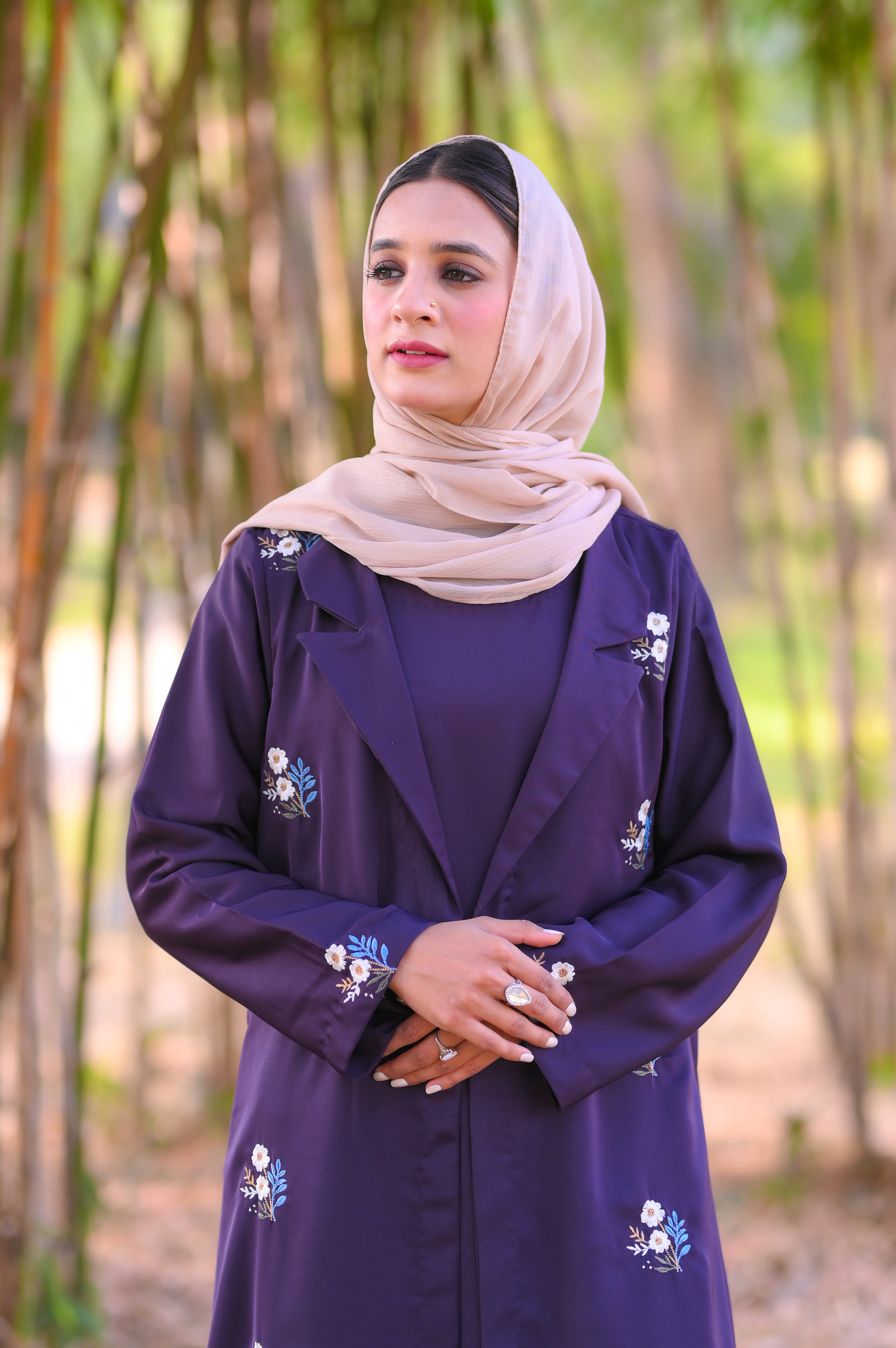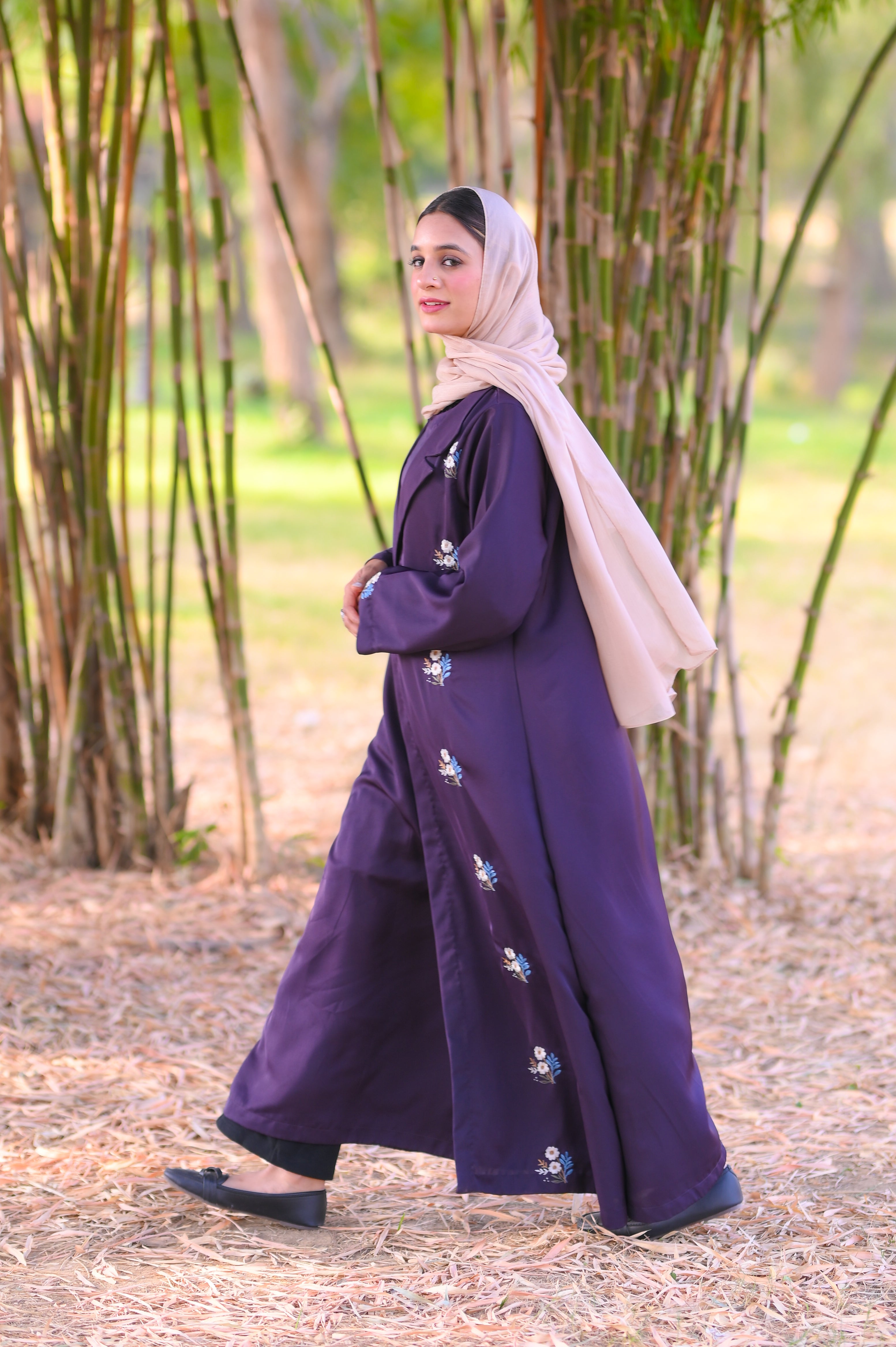 This abaya carries a serene, refined charm with its deep orchid-purple color and soft floral embroidery placed gracefully across the front. Its coat-style silhouette gives it a polished, structured look while keeping every element beautifully modest.